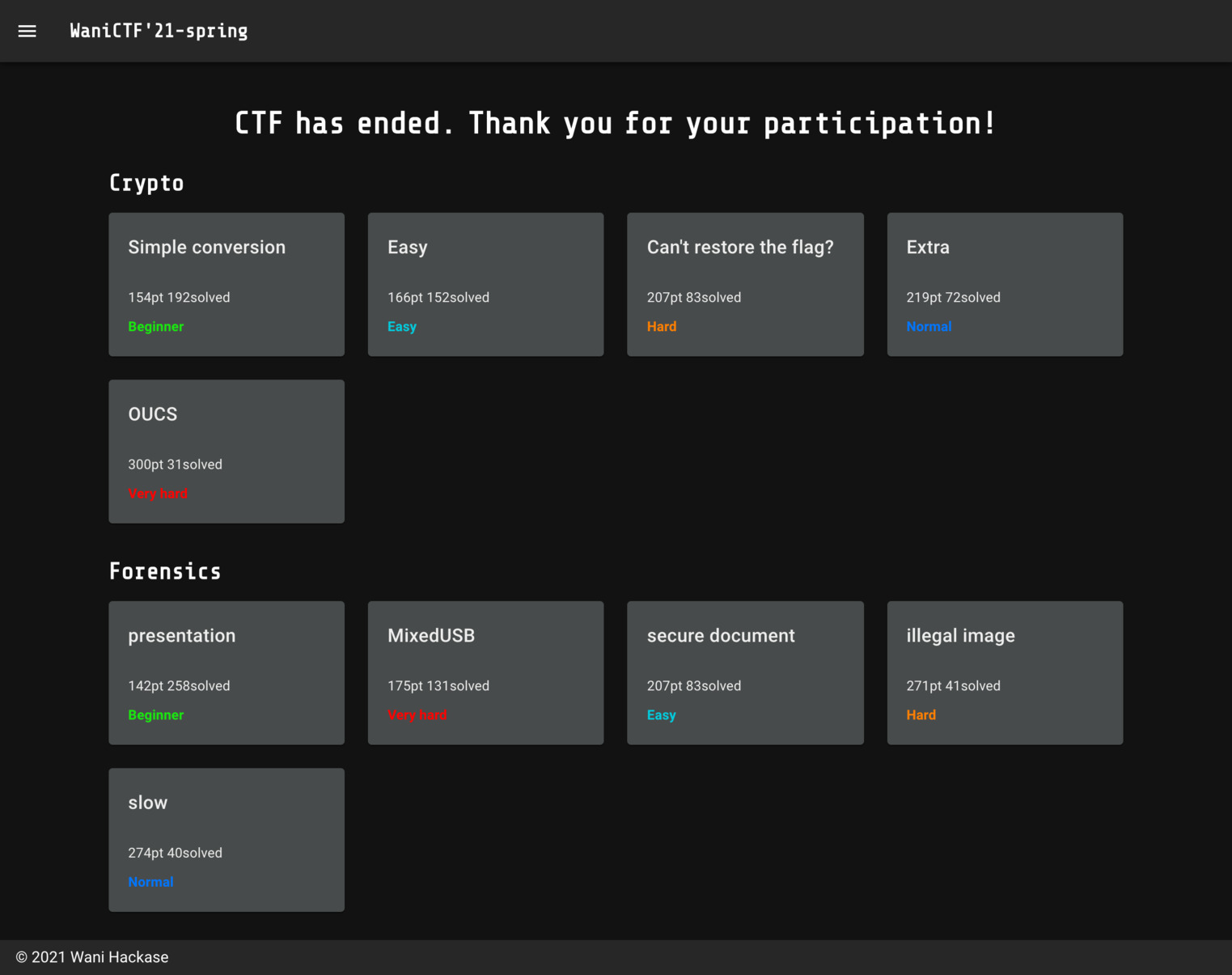 プレイヤーの皆様、WaniCTF'21-spring運営メンバーに感謝を申し上げます。