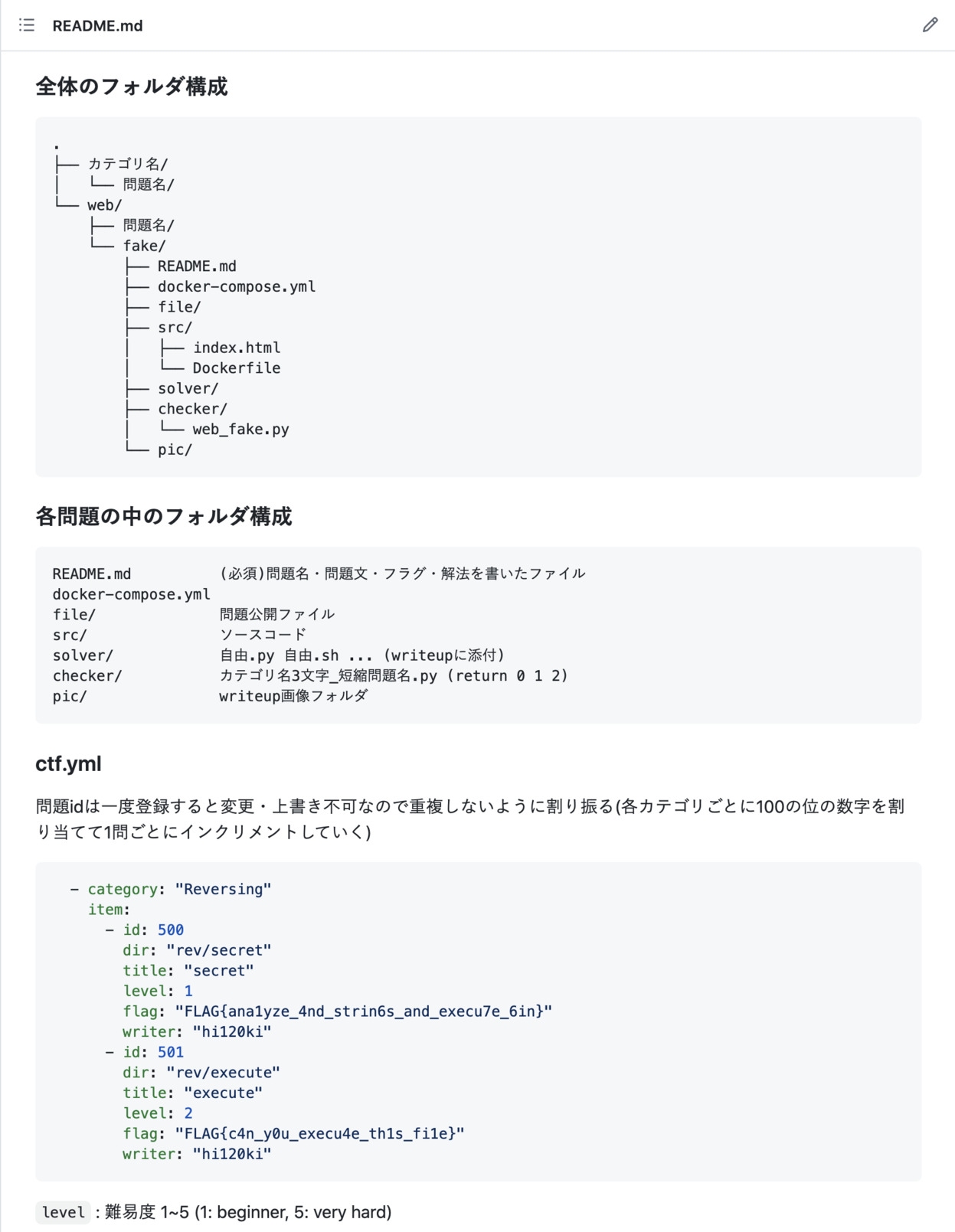 以前のWaniCTFdは問題をスコアサーバーに登録するときに管理ページから一問ずつ手作業(コピペ)で入力・ファイルアップロードを行っていました。そのためWaniCTF2020ではWeb問題の一つで問題添付ファイルのアップロードを忘れており気付くまでguess問題となってしまいました。